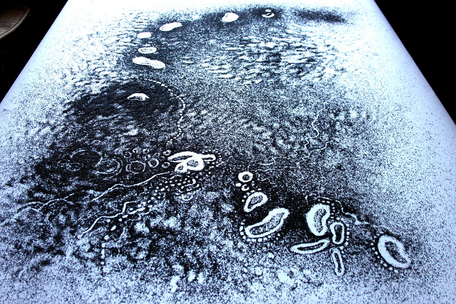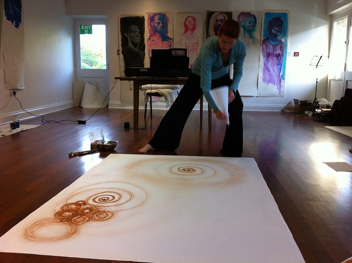 For the show, the sand painting was unplanned, completely improvised, responding to the moment and the energies in the room. People would gather round, everyone watching and wondering what was going to happen next. At some point I would quietly take the edge of the paper and gave it a little shake… the sand shifted and the painting was gone. They gasped every time, always surprised.