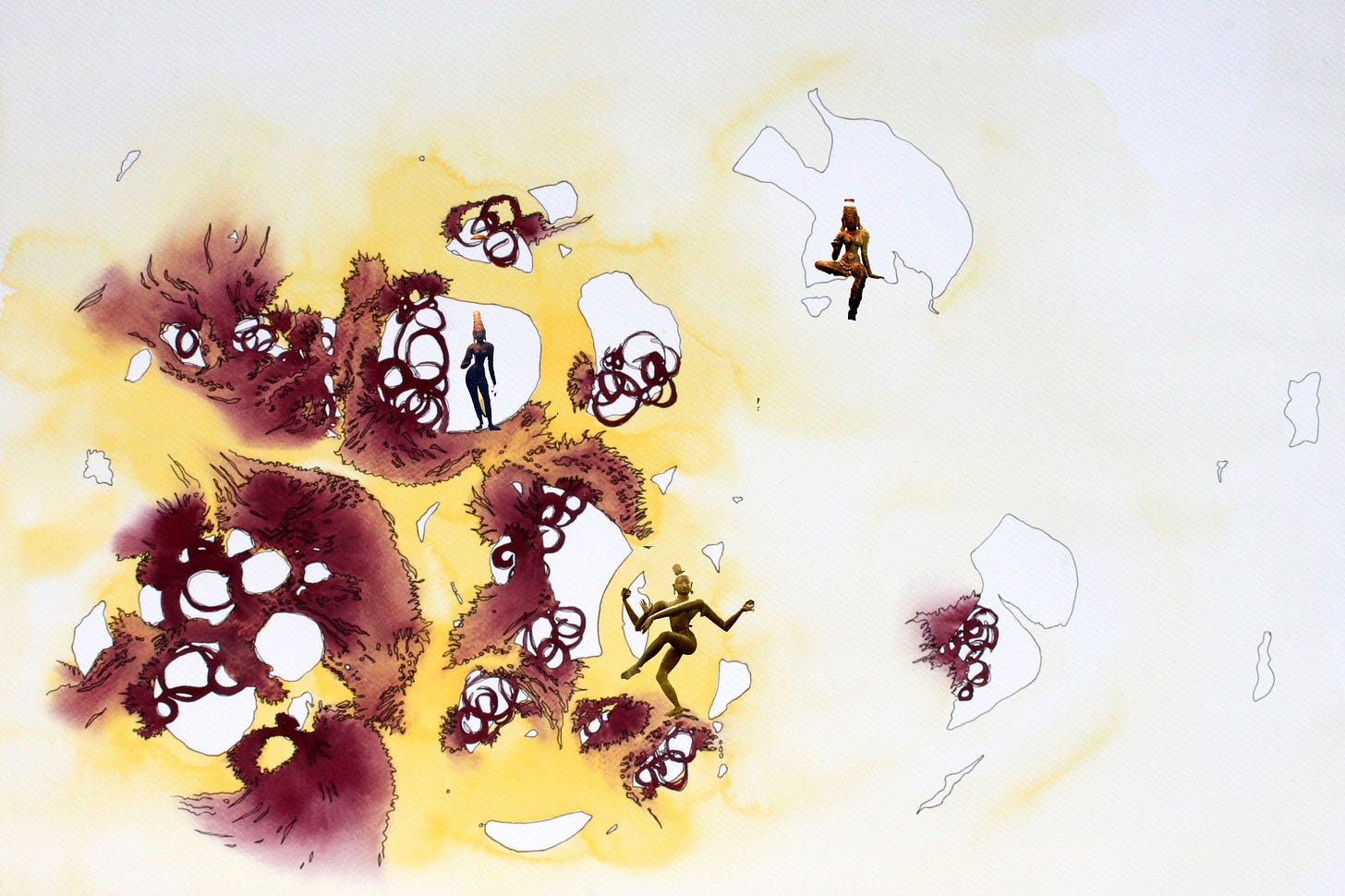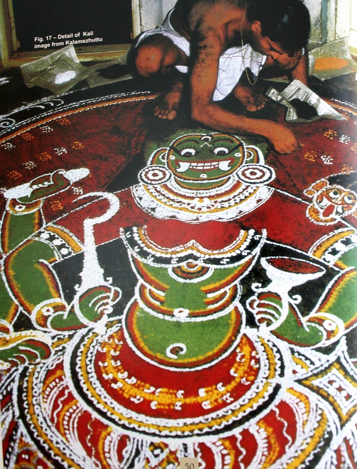 As well as the live poetry, I wanted to have something else that was alive and unpredictable, something that would embody the spirit of the unseen forces of living things. I came up with the idea of sandpainting. I had seen Tibetan monks in Dharamsala creating mandalas out of coloured sand. It was a long process that took many days, at the end of which the mandala was destroyed, swept up, leaving nothing behind, a commentary on the transience of life. After I had been to Kerala in the winter of 2012/2013, I found about a similar type of painting in a Hindu context (though this had a different ritual meaning).