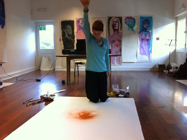 I don’t know why I was able to do it as a performance. Perhaps because I too knew that I could destroy what I was making at any point, that nothing was committed or fixed, everything was in flux. I was truly playing, responding to what happened, on the paper, in the room, in my body – responsive feedback loops that somehow managed to remain uninterrupted by thoughts about results or external judgements.
